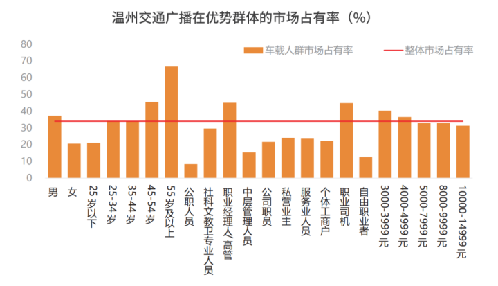 温州交通广播对男性、25岁及以上、职业经理人/高管、职业司机、月收入在3000-4999元等社会精英人群的吸引力较强,车载人群中市场占有率均超过整体市场占有率。