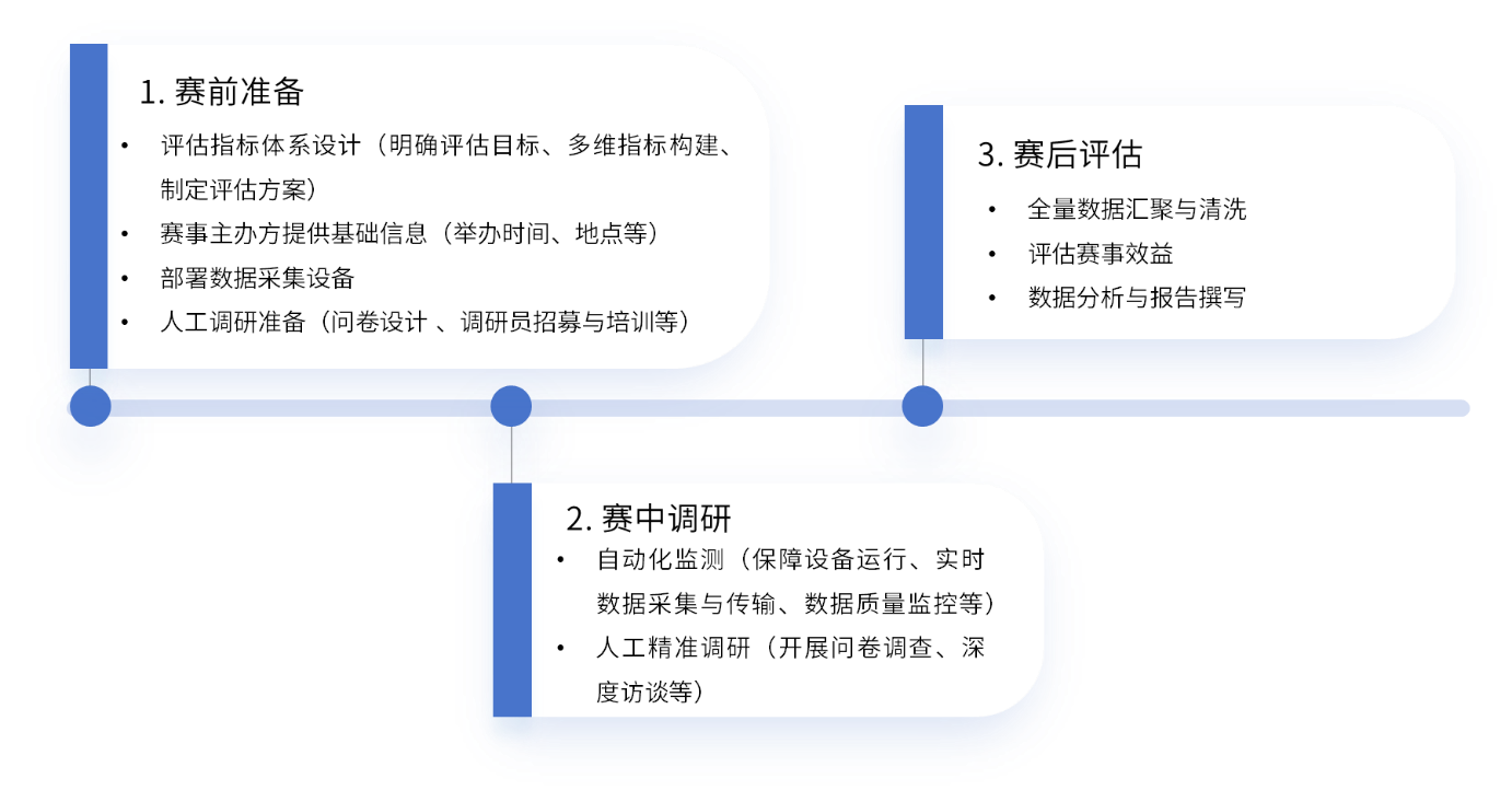 l 赛前:结合赛事规模与城市特点,设计专属评估指标体系,制定详细评估方案,完成问卷设计与调研员培训,同步收集赛事主办方提供的基础信息(举办时间、地点、预期目标等);
