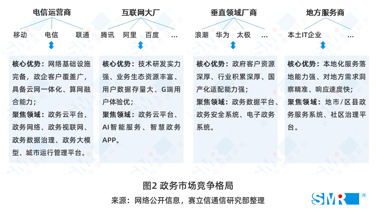 从竞争格局看,当前政务市场已进入体系化竞争阶段,并呈现出多元的竞争态势。主要参与者大致划分为四类:以网络布局构建护城河的电信运营商、以技术锐度著称的互联网大厂、以精耕行业创造价值的垂直领域厂商以及在本地化服务中寻求突破的地方服务商。