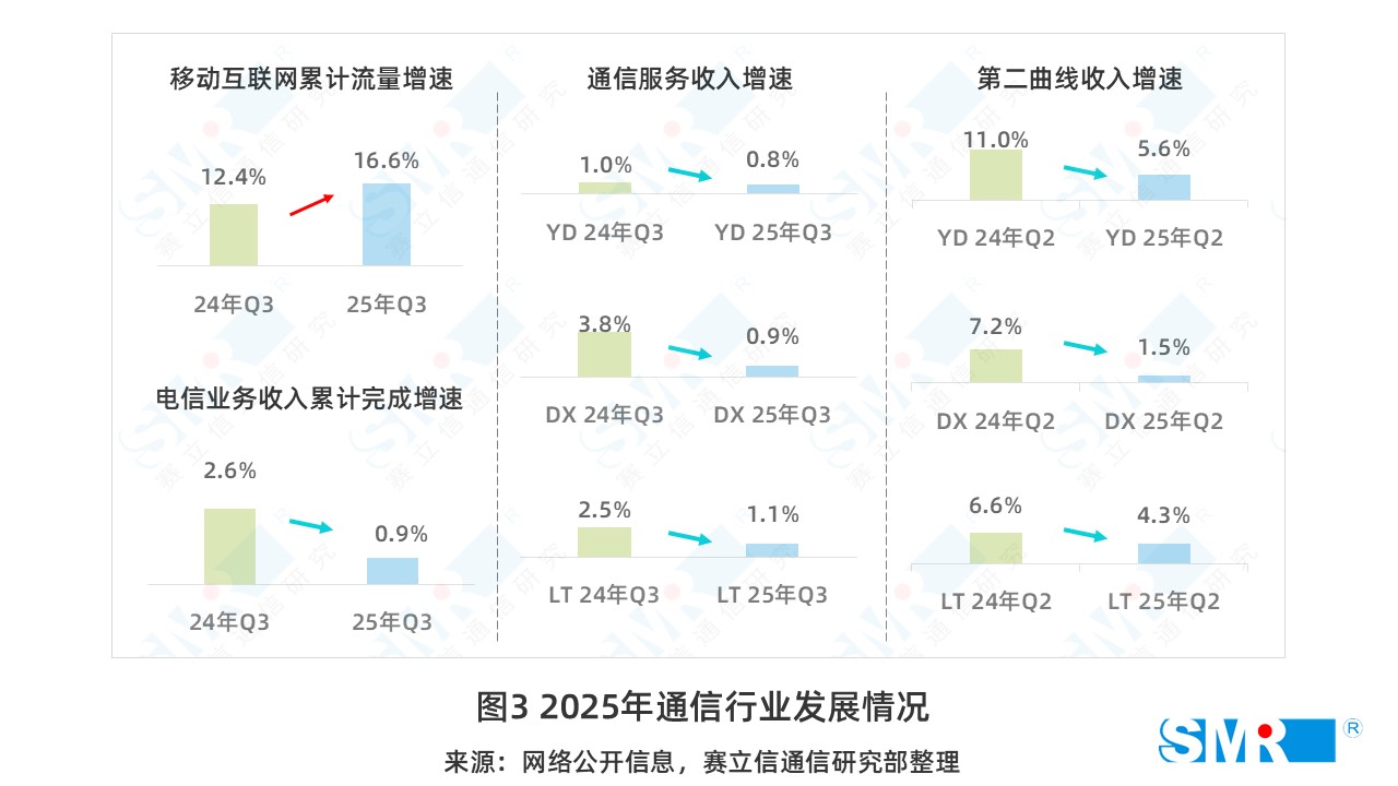从通信行业现状看,工信部发布的数据显示,2025年前三季度电信行业呈现增量不增收的特征,主要体现在电信业务收入增速较2024年同期出现下滑;移动互联网累计流量同比保持双位数增长。运营商公布的数据显示,2025年前三季度通信服务呈现增长动力不足的特征,主要体现在三大运营商的通信服务收入增幅普遍偏低;2025年前二季度,第二曲线收入增速放缓,集中反映在运营商相关收入均维持个位数增长。