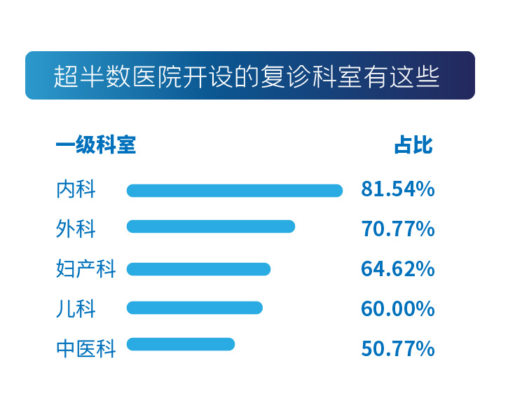 目前开通复诊服务的65家医院中,有81.54%(53家)的医院开通了内科科室;除内科外,超半数医院开设的复诊科室还有外科、妇产科、儿科与中医科。