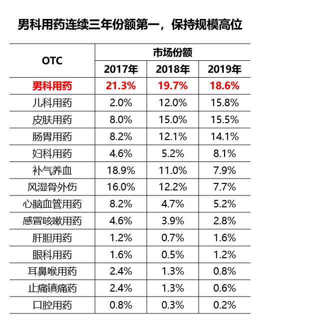 男科用药近三年市场份额都在20%左右,在线上OTC销售中排名第一,属于高销售额、低增长的“现金牛”品类,今年前5月线上销量达到33.5亿元。
