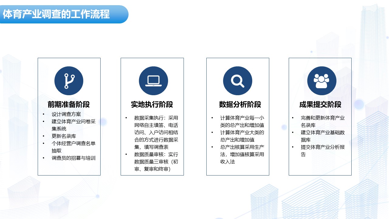 标准化服务流程,实现闭环管理。调研工作严格遵循四阶段流程:前期准备阶段完成方案设计、问卷系统搭建与名录库更新,为调研筑牢基础;实地执行阶段聚焦数据采集与质量审核,确保源头数据准确;数据分析阶段采用生产法核算总产出、收入法核算增加值,精准匹配政策考核指标;成果提交阶段完善名录库与基础数据库,并输出专项分析报告,形成 “数据采集-分析-应用” 的闭环。