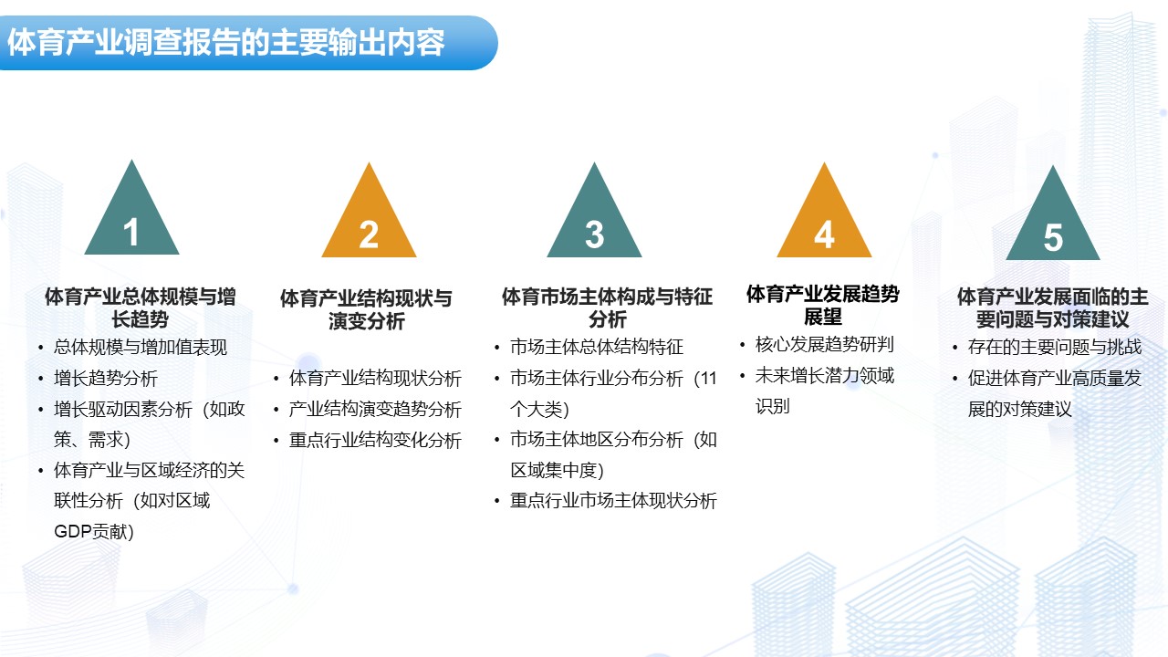精准成果输出,赋能决策落地。赛立信的调查报告涵盖五大核心内容:一是产业总体规模与增长趋势,包括增加值表现、驱动因素及对区域 GDP 的贡献分析;二是产业结构现状与演变,解析 11 个大类的结构特征与变化规律;三是市场主体构成分析,呈现企业的行业与地区分布特点;四是发展趋势展望,识别潜力增长领域;五是问题与对策建议,为破解产业瓶颈提供方向。这些成果直接对接政策制定、行业监管与企业经营的实际需求,成为体育产业高质量发展的“数据参谋”。