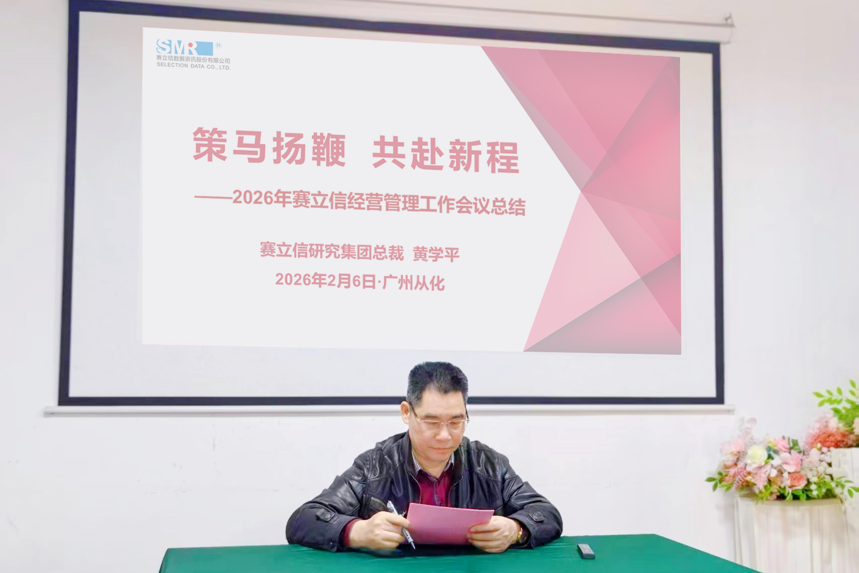 2026年2月5日至6日,赛立信研究集团2026年经营管理工作会议于广州从化顺利召开。赛立信研究集团总裁黄学平、副总裁黄引敏、财务总监黄学军与赛立信旗下各子公司负责人及总监以上管理人员齐聚一堂,全面总结2025年集团经营发展情况,深入分析当前市场形势,研究部署2026年的经营目标与重点工作任务,并举行了年度经营目标签约仪式。