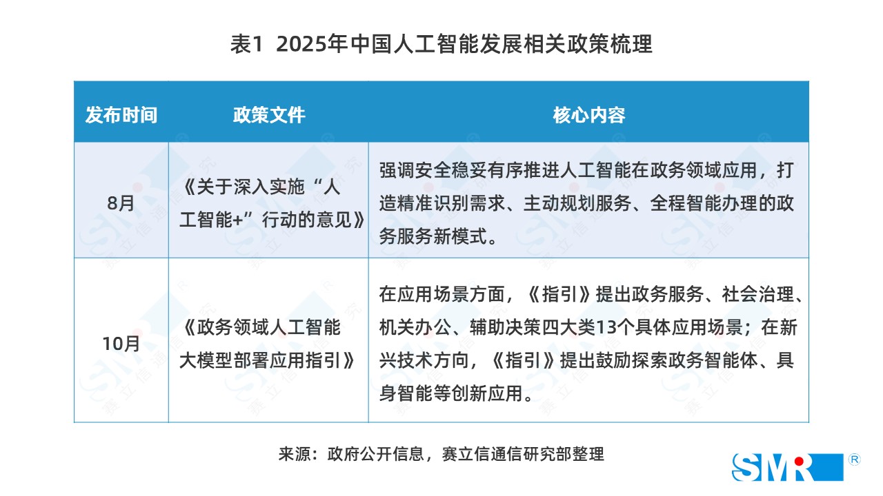 从政策角度看,2025年国家发布了两项核心政策,分别为《关于深入实施“人工智能+”行动的意见》和《政务领域人工智能大模型部署应用指引》,两项政策均明确指向以政策创新引领推动“人工智能+政务”加快普及和深度融合。值得关注的是,《政务领域人工智能大模型部署应用指引》是国内首个公开面向政务领域大模型应用的专项政策文件,标志着国内政务领域人工智能大模型应用迈入有序推进新阶段。总体来看,国内人工智能政策体系正从战略谋划迈向系统构建。