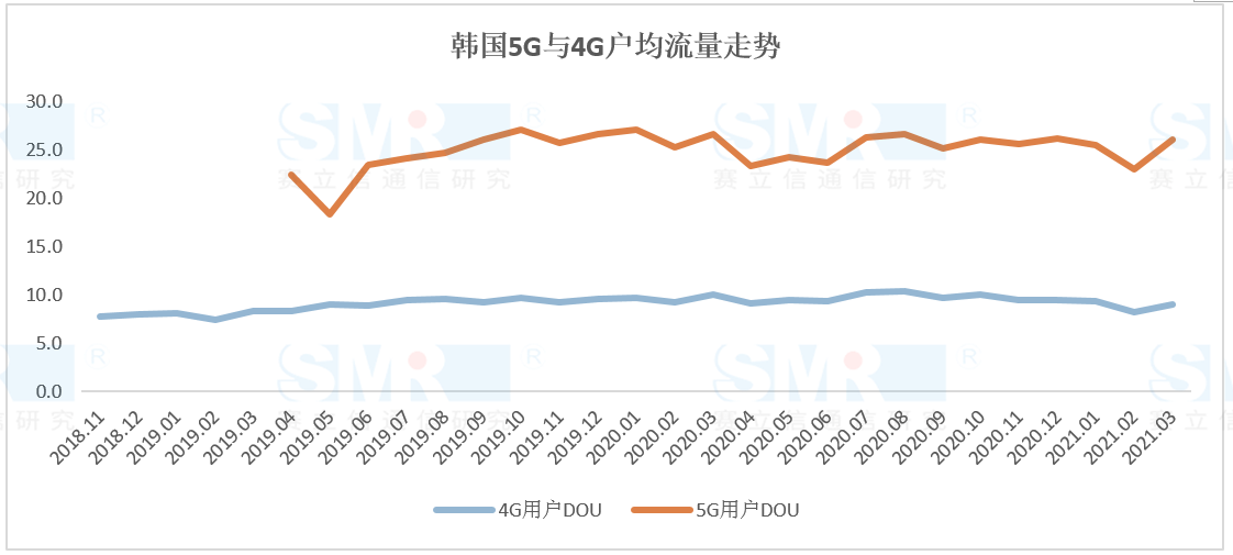 5G用户发展带来的流量效应明显。从数据上看,5G用户流量正不断攀升,而4G用户流量在明显下滑。到2021年3月,韩国的5G用户流量已经超过4G用户流量。用户规模的增减变化是主导因素。若从户均情况来看,尽管5G用户户均流量一开始就甩开4G用户户均流量(长期处于2.5-2.9倍水平),但同样遭遇天花板,卡在25-26GB左右的水平位上难以突破。