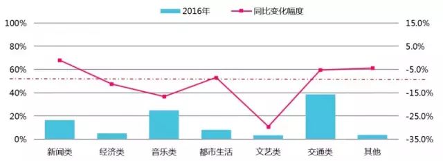 与2015年相比,2016年广播的广告吸纳量有所下滑,整体广告吸纳量下滑幅度在9.0%左右,其中降幅较大的文艺广播,广告量下滑幅度接近30%,其次是音乐广播和经济广播,交通广播有轻微下滑,新闻和都市生活广播同比基本持平。