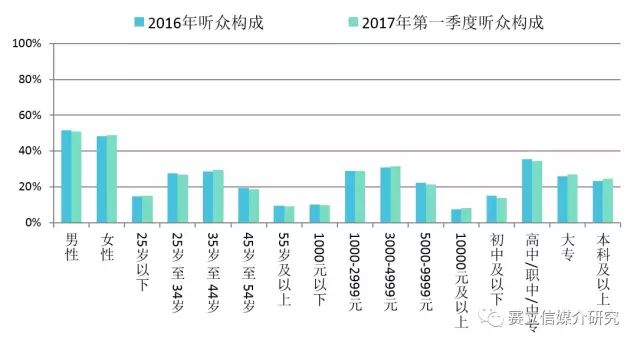 从广播听众构成来看,在2017年第一季度以下细分广播听众构成有所增大: