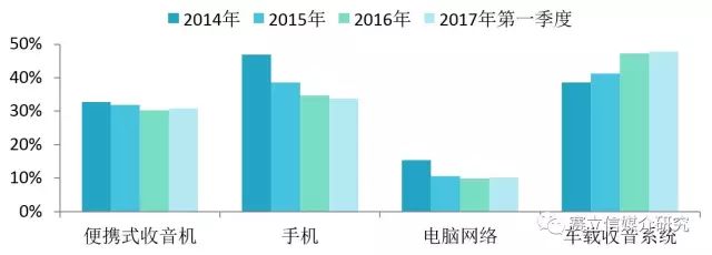 分收听终端来看,2017年第一季度车载收音系统使用率接近50%,手机使用率达33.8%,排名第二,便携式收音机使用率维持在30%以上,电脑网络在10%左右水平。