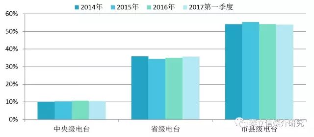 中央级电台市场占有率在连续三年小幅上升之后,在2017年第一季度较2016年略减小0.3%,但仍然维持在10%以上。