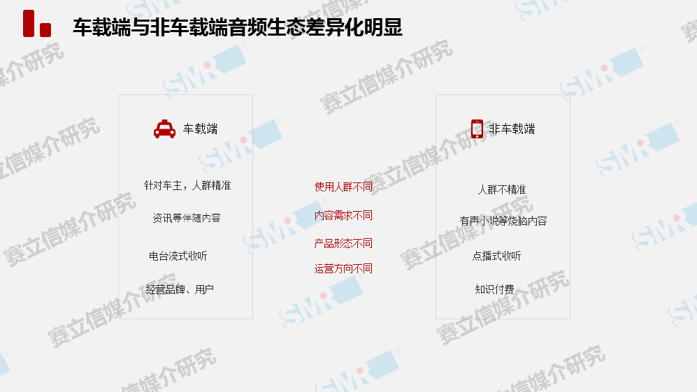 在车载场景中,由于驾驶对视觉集中度的天然要求,人对音频的依赖度更高。而在非车载场景,依赖度较低。此外,在使用人群、内容需求、产品形态、运营方向等四方面,车载端与非车载端存在明显差异。