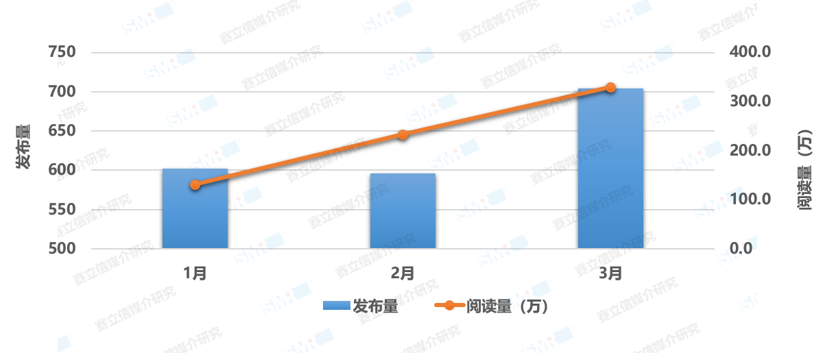 3月,南宁台在微信和抖音两个平台的声量均有长足的提升,南宁台微信端的累计阅读量达330.0万,较1月份增长1.5倍,较2月的涨幅超过40%,说明3月南宁台在微信端的用户活跃度更高。
