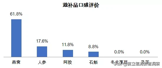 优质燕窝的口感细腻爽滑且带有一种蛋白质清香,在各滋补品口感评价中,燕窝口感排名第一,61.8%的消费者认为燕窝好吃。