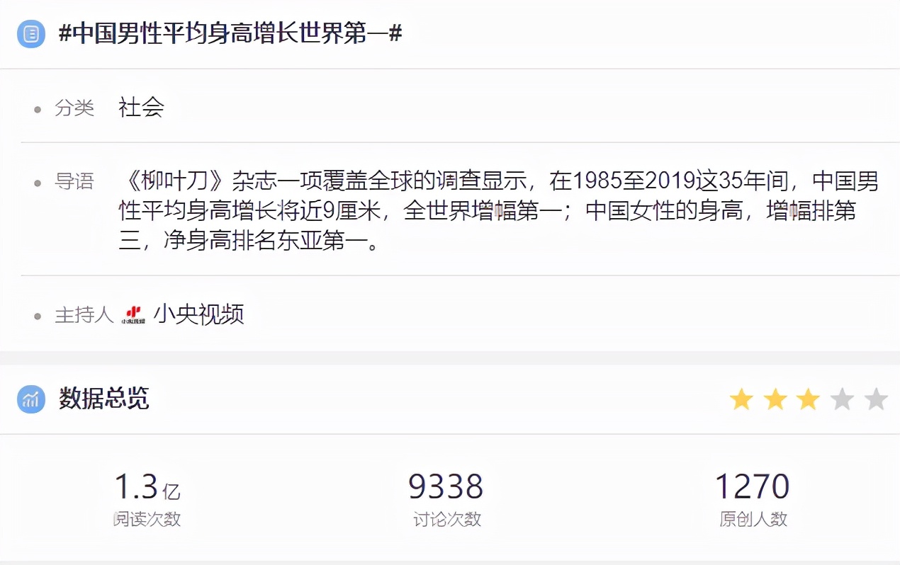 近日,据权威医学杂志《柳叶刀》一项覆盖全球的调查显示,1985年到2019年,中国男性平均身高增加近9厘米,增幅全球第一。这条消息一出便引起网友热议,登上了平台热搜,截至目前,已有近1.3亿人阅读该词条。