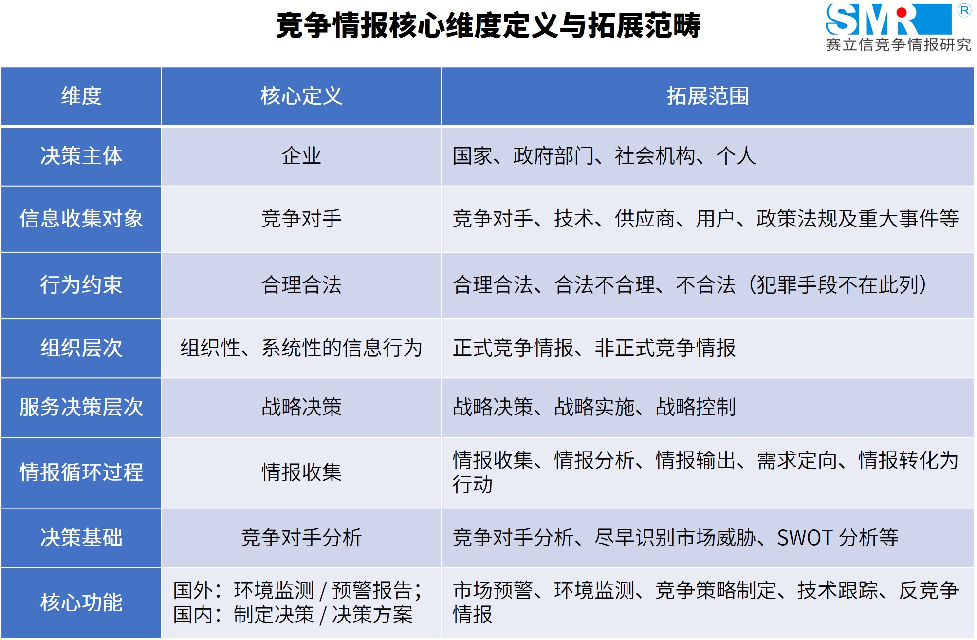 关于竞争情报的定义众说纷纭,但它的核心边界和关键维度,我们可以用一张“约束条件+核心内容+谱带内容”的对照表,一次性说清: